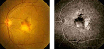 혈관신생을 동반한 심출형 나이관련황반변성의 안저사진 및 현광 안저 혈관조형술 사진
